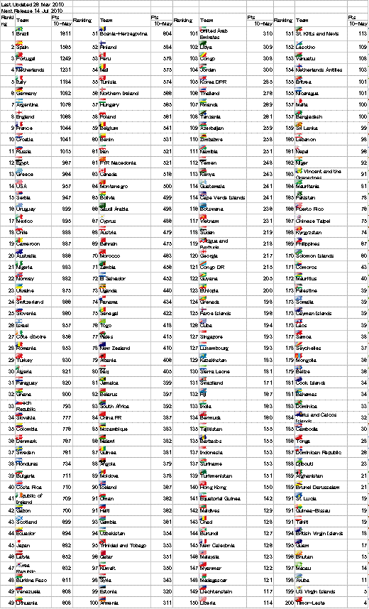 2010年5月10日時点のFIFAランキングによれば、ベスト10は、1位ブラジル(1611ポイント)、2位スペイン(1565ポイント)、3位ポルトガル(1249ポイント)、4位オランダ(1231ポイント)、5位イタリア(1184ポイント)、6位ドイツ(1082ポイント)、7位アルゼンチン(1076ポイント)、8位イングランド(1068ポイント)、9位フランス(1044ポイント)、10位クロアチア(1041)となっている。