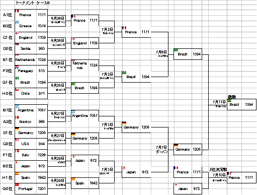 FIFAランキングで全64試合を予測する。グループリーグではAからHまでの8つのリーグの1位、2位が決勝トーナメントに進む。日本は3戦全敗で4位となりトーナメントには進めない。優勝はブラジル、準優勝はスペイン、3位ドイツ、4位フランスとなる。