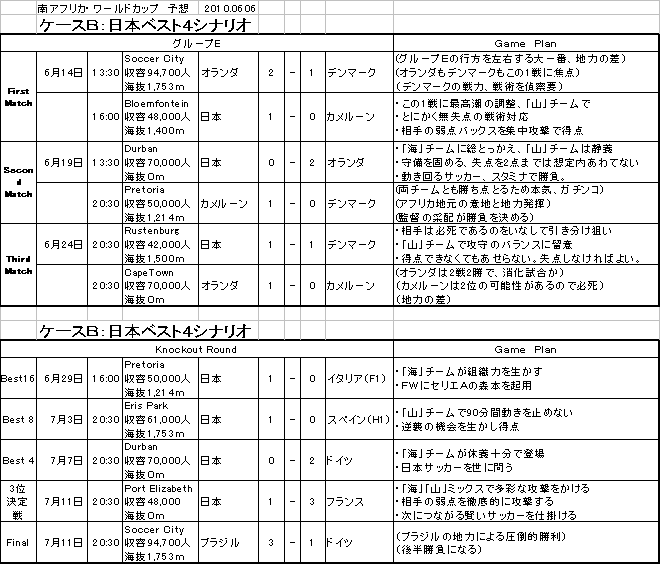 2006ドイツ大会で苦杯をなめた日本が、2010年南ア大会に掲げた目標は、ベスト4であった。ワールドカップ直前になってもこの目標は変えられていない。ここでは愚直に、ベスト4という目標はどのような相手に勝つ必要があるのか、どれほど困難なのか、ベスト4まで勝ち進むケースを想定してみる。