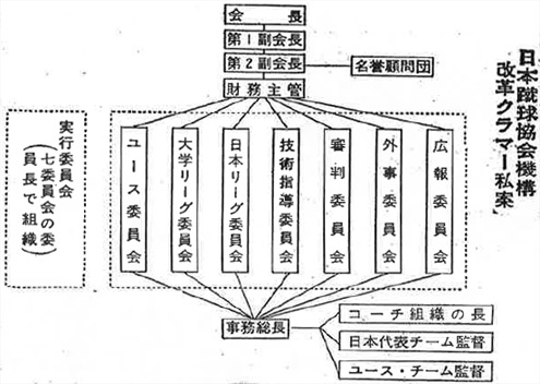 以上のような、いろいろな目標や事務的な仕事を、能率よく進めていくために、いまの日本蹴球協会の組織は、根本的に作り直さなくてはならない。現状のままでは、日本のサッカーはこれ以上伸びない。委員会に仕事を分担させ、権限を与え、若くて有能な人材に仕事をさせ、それを総合していくような組織にしなければならない。