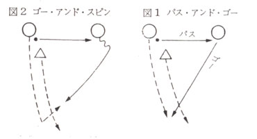 パスしたあと走る、そこですぐパスを受けるのではなしに、走って、すぐ急に方向転換をして、相手のマークをはずしてから、パスを受ける。(図2) これが“スピン”である。