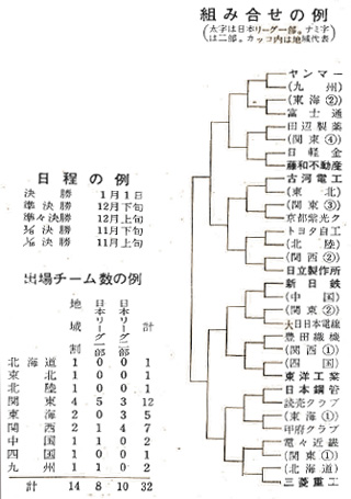 というわけで、かりに組合せを作ると別表のようになる。たとえば、1回戦で釜本のいるヤンマーが、九州へ行って地元チームと対戦すれば、じゅうぶん九州でも入場料をとって見せるだけの魅力ある試合になるのではないか。地元チームが強くなればなるほど、試合の魅力は増し、入場料やテレビの収入もふえて地元がうるおうから、強化や普及もやりがいがあろうというものである。