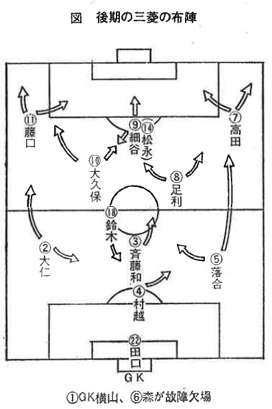 三菱快進撃にアクセルをかけた後期の2試合目、10月25日の対日立戦では、三菱のシュートが9だったのに対して、日立は14とかなり上まわっていた。しかも日立はスイーパーの川上、ストッパーの横谷など、バックラインのプレーヤーを含め、ほとんど全員がシュートを記録している。三菱のバックでシュートをしたのは、落合だけだった。数字のうえでは明らかに日立が押している。翌朝の新聞で「日立の優勢な試合だった」と書いてあるのもあった。