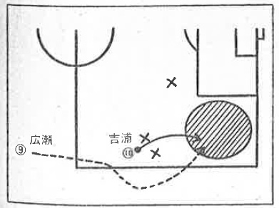 右タッチラインぎわで右ウイングの吉浦茂和君がボールを持った。しかし相手の守り2人にラインぎわに追いつめられ、内側にも守りがいてパスを出すところがないようにみえた。前の2人を抜いて前方のオープンスペースへ自分で走り抜けることも不可能にみえた(図)。にもかかわらず、吉浦君は、浮き球で2人の相手の頭越しにボールを出そうとした。