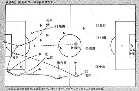 決勝では、それまでストライカーだった長身の村田一弘を守備ラインに下げてストッパーにし、前線に二宮と並べて原田を使った。これはいい考えで国見の勝因の一つである。