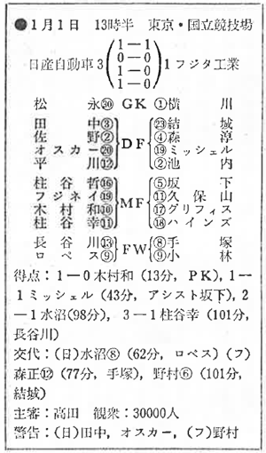 ヤマハとの準決勝では、この大会でぐんぐん調子を上げてきた若い長谷川健太をフルに使って勢いに乗せ、水沼を温存している。その長谷川が後半6分にこぼれ球を拾い、得意の強シュートで決勝点をあげた。
