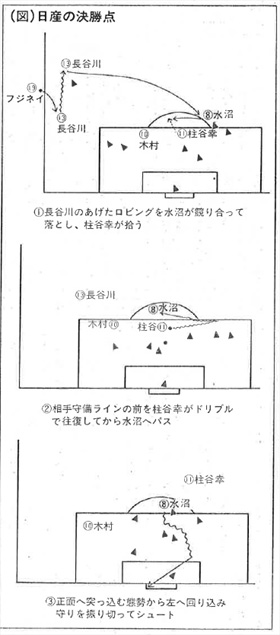 柱谷幸のドリブルに引きずられたうえ、水沼の巧みですばやい突っ込みに逆をとられて、フジタの守りはなす術がなかった。(図)