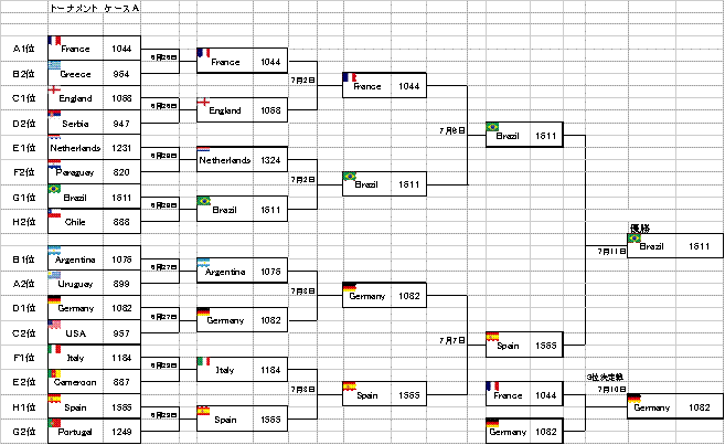 FIFAランキングで全64試合を予測する。グループリーグではAからHまでの8つのリーグの1位、2位が決勝トーナメントに進む。日本は3戦全敗で4位となりトーナメントには進めない。優勝はブラジル、準優勝はスペイン、3位ドイツ、4位フランスとなる。