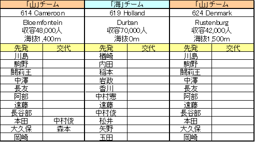 初戦のカメルーンが最も大事であるので、山チームは過去4戦の先発メンバーで編成する。海チームは、2014ブラジル大会につながる20歳代前半の選手に経験をつませることを主な目標に、戦術に合わせてメンバー配置する。